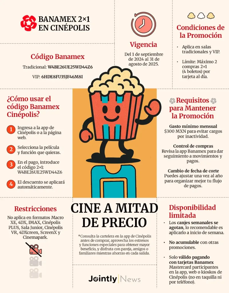 La promoción 2×1 de Banamex en Cinépolis ofrece a los usuarios la oportunidad de adquirir dos boletos al precio de uno. Utiliza el código Banamex W4BE26UE25WD44Z6.