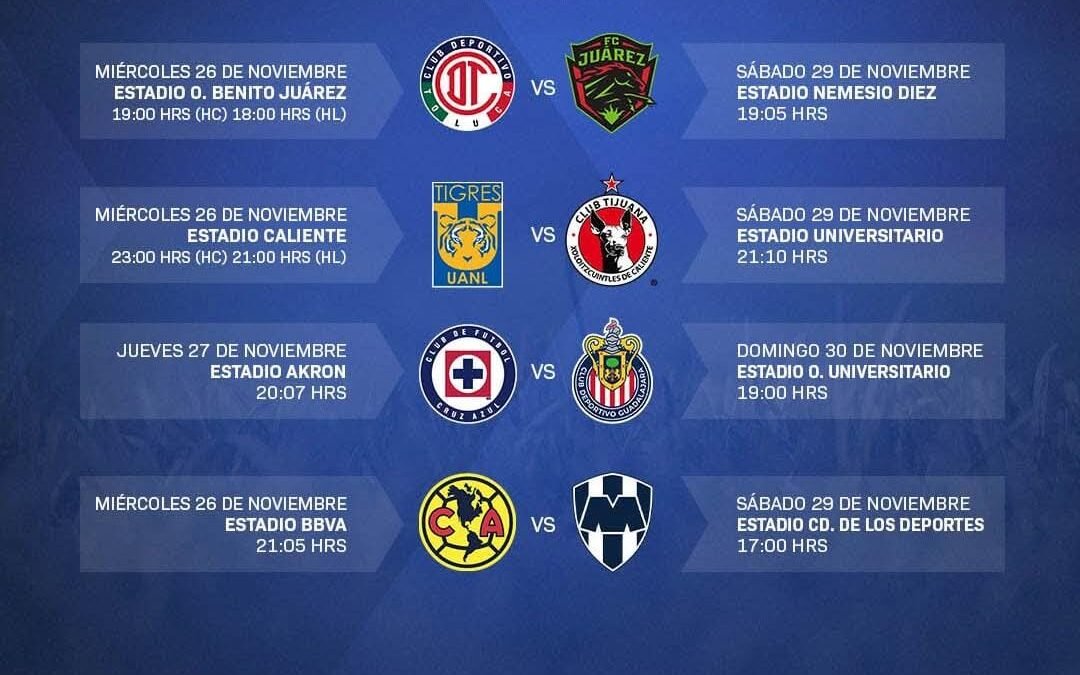 | Miércoles 26 | 19:00 | FC Juárez vs Toluca | O. Benito Juárez |