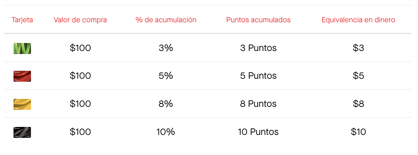 Cada vez que se utiliza la tarjeta, es posible acumular puntos que pueden ser canjeados por recompensas. El sistema de acumulación varía según las promociones vigentes y el tipo de compra.
