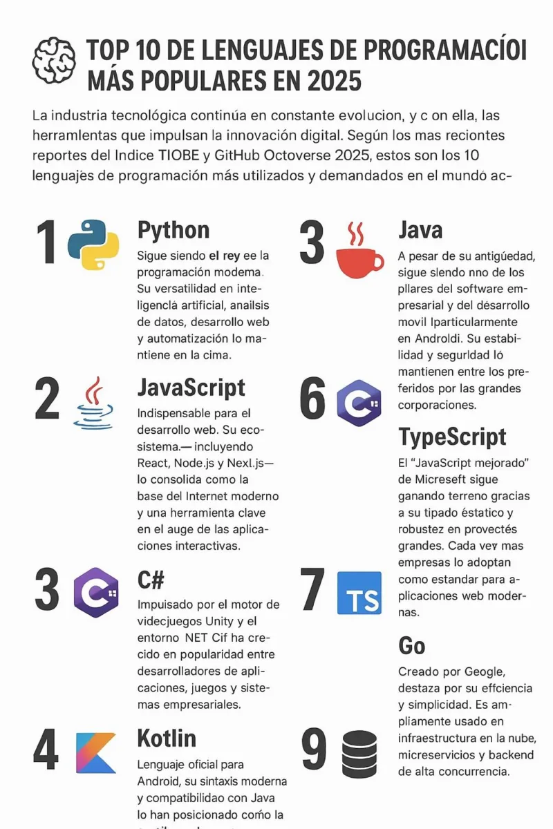La tecnología sigue avanzando, y con ella las herramientas para la innovación digital. Según los últimos informes del Índice TIOBE y GitHub Octoverse 2025, estos son los 10 lenguajes más usados y demandados en el mundo actual.