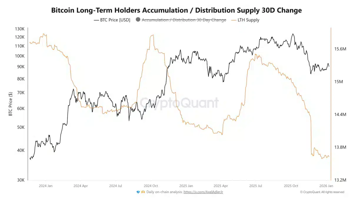 La conducta de los long-term holders (LTH), es decir, los inversionistas que mantienen Bitcoin por largos períodos, podría ser clave para establecer el próximo rally importante. Estos tenedores, en el año 2025, hicieron transacciones de cerca de 300,000 millones de dólares en Bitcoin que habían permanecido inactivos durante más de un año. Este fenómeno sucedió simultáneamente con la fluctuación del mercado y las caídas en el precio. Sin embargo, en este instante parece que esa presión de venta se ha estancado, y la estabilización de esta oferta, especialmente si la relación entre los holders a corto y largo plazo continúa siendo positiva, ha sido un precursor del desarrollo de etapas de base y potenciales incrementos en el pasado.
