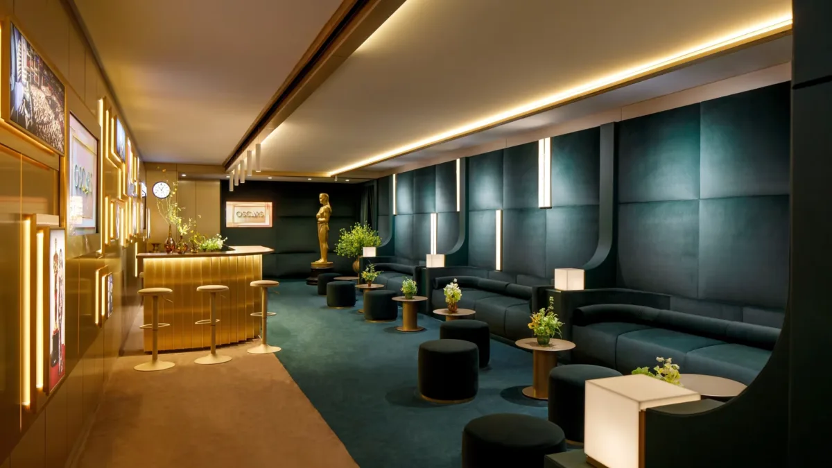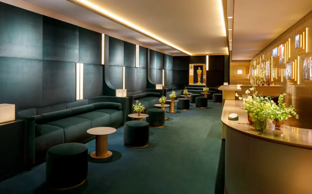 Otro elemento confirmado para 2026 es la presencia de retratos de grandes estrellas de la historia del Oscar dentro de la sala. Ese detalle importa porque convierte el espacio en algo más que una lounge de lujo: también funciona como cápsula de memoria de la Academia. Es backstage, sí, pero backstage con vocación de museo portátil.