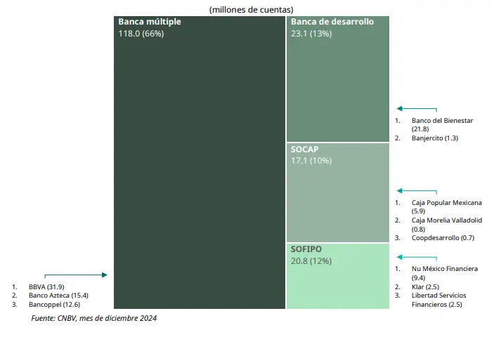 Las cuentas de depósito continúan siendo la vía principal para acceder al sistema financiero. El informe indica que hay más de 179 millones de cuentas activas, tomando en cuenta que un individuo puede tener varias. La emisión de más de 7 millones de nuevas tarjetas de débito en el último año es indicativa del aumento en nóminas digitales, pagos formales y programas sociales bancarizados. Sin embargo, una parte significativa de estas cuentas solo se emplea para retirar dinero o muestra movimientos ocasionales. La mayoría del tiempo el dinero está estático en la cuenta durante poco tiempo.
